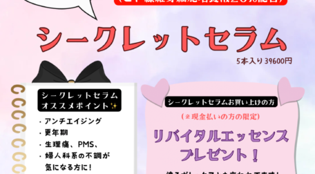 大人気のフェミニンケアアイテム シークレットセラムをお買い上げの方に リバイタルエッセンスをプレゼント! 炭酸パックでツヤツヤお肌になれるリバイタルエッセンス♪ 塗るボトックスとも言われ、お肌が弱い方でもお使いいただけま … 続きを読む 1月特典付クーポン